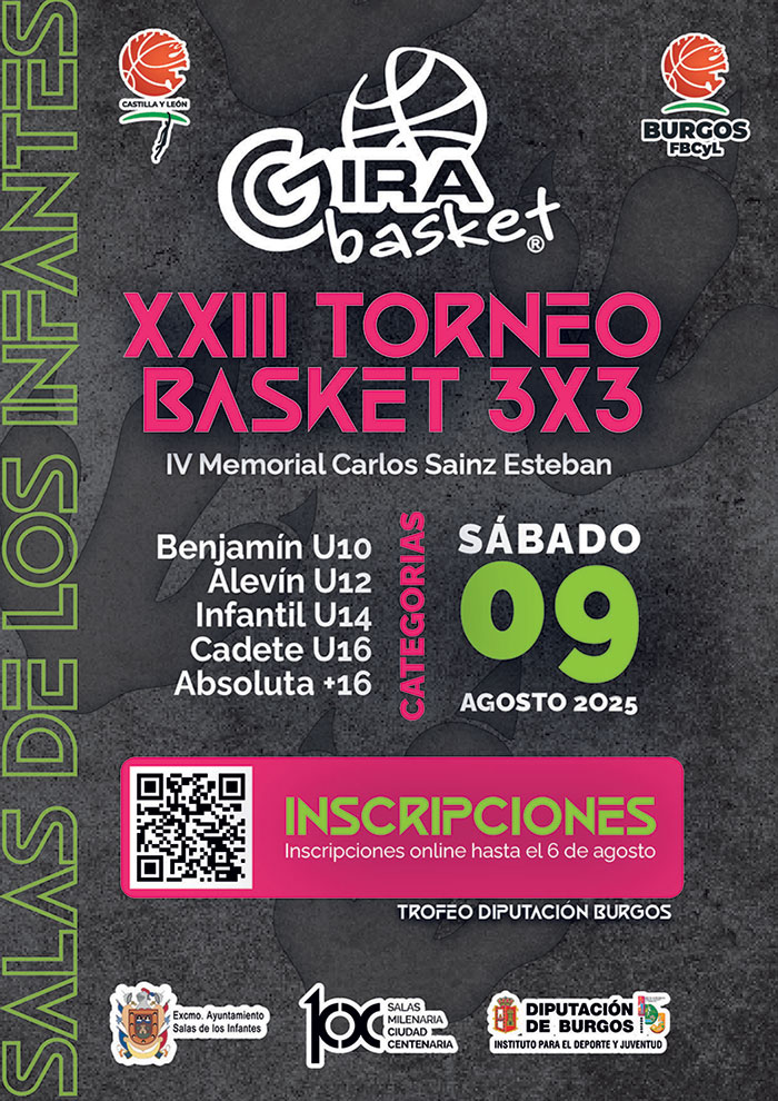 El próximo sábado 9 de agosto, Salas de los Infantes se convertirá en la capital del baloncesto en la provincia con la celebración del XXIII Campeonato 3x3 “Trofeo Diputación de Burgos”, una cita consolidada en el calendario deportivo estival y que este año volverá a rendir homenaje a Carlos Sainz Esteban con la cuarta edición de su memorial.