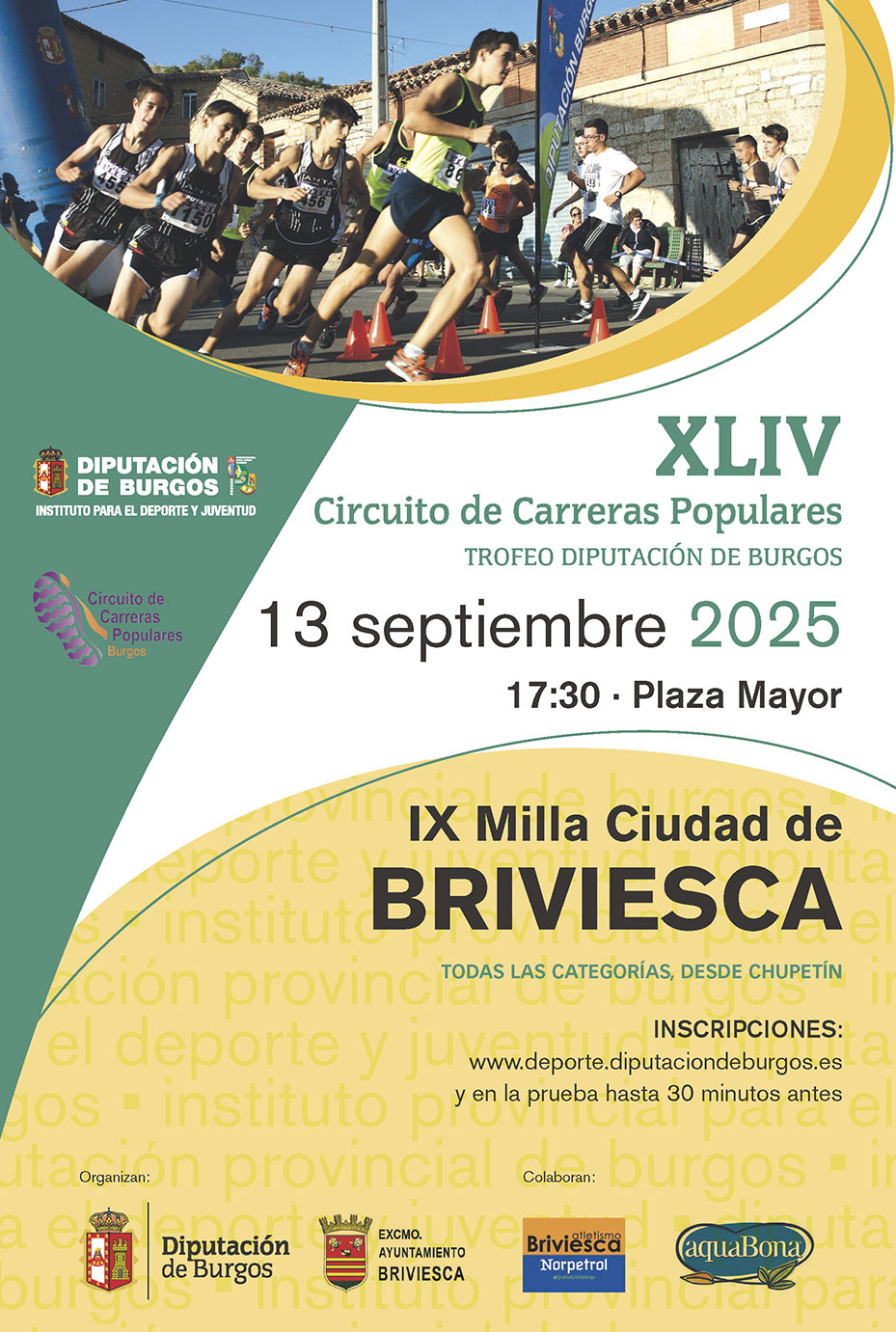 La capital de La Bureba vivirá el próximo sábado 13 de septiembre una de las citas clásicas de su calendario deportivo con la celebración de la IX Milla Ciudad de Briviesca, incluida en el XLIV Circuito Provincial de Carreras Pedestres Populares que organiza el Instituto Provincial para el Deporte y Juventud de la Diputación de Burgos.