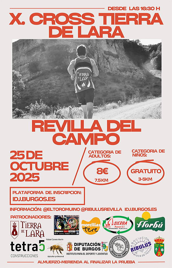 El Instituto Provincial para el Deporte y Juventud (IDJ) de la Diputación de Burgos organiza, en colaboración con el Ayuntamiento de Revilla del Campo, la Asociación de Deportes Tierra de Lara, la Asociación Ribulus y El Toro Muino, la décima edición del Cross Tierra de Lara. Esta cita deportiva popular tendrá lugar el sábado 25 de octubre en Revilla del Campo, dentro del marco del Circuito Provincial de Carreras Populares.