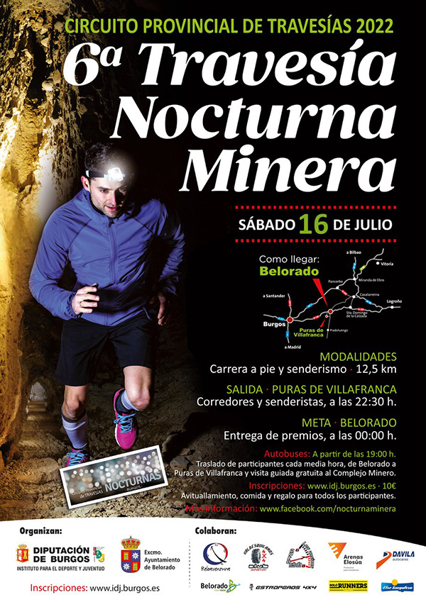 La Travesía Nocturna Minera, 3ª prueba del Circuito de Travesías Nocturnas, se celebrará el próximo sábado 16 de Julio de 2022 en las modalidades de carrera a pie y senderismo. La salida será a las 22:30 h. desde Puras de Villafranca y la meta estará ubicada en Belorado. Habrá autobuses que trasladarán a los participantes desde Belorado a Puras desde las 19:00 h. y cada media hora.