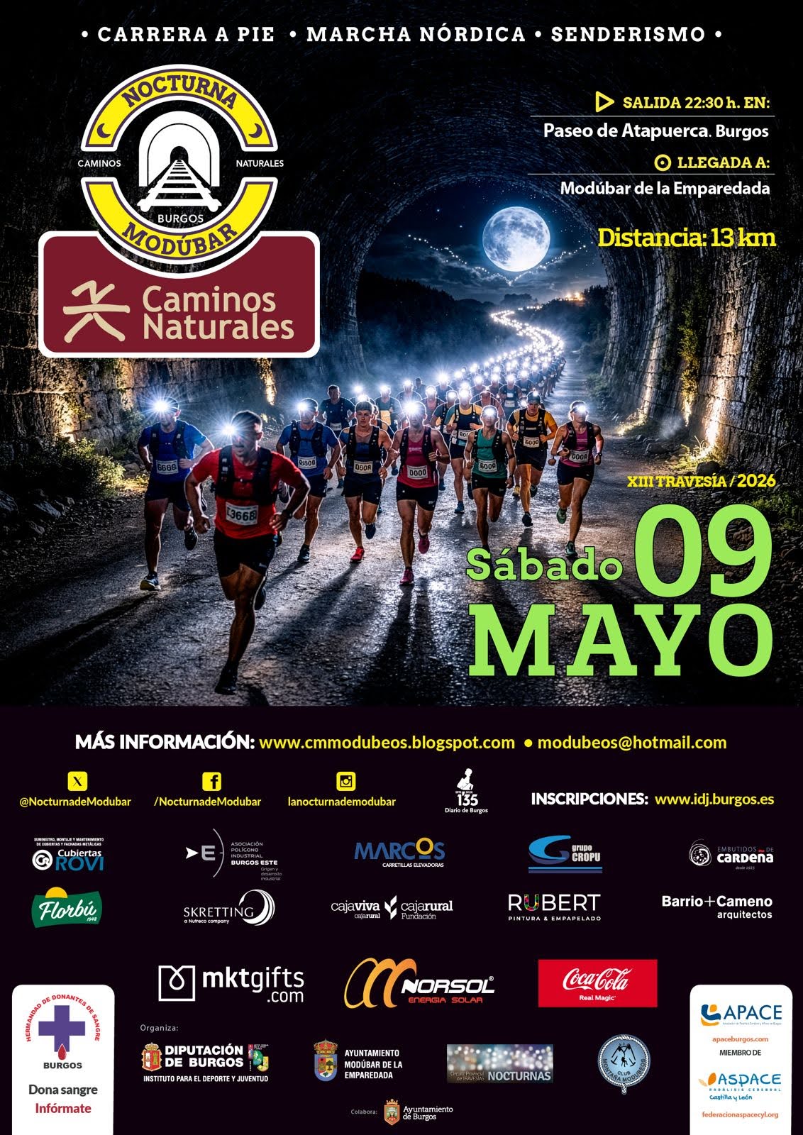 La XIII Nocturna de Modúbar - Caminos Naturales, cuyo recorrido volverá a unir Burgos capital y Modúbar de la Emparedada a través del Camino Natural Santander-Mediterráneo, se celebrará el sábado 9 de Mayo.