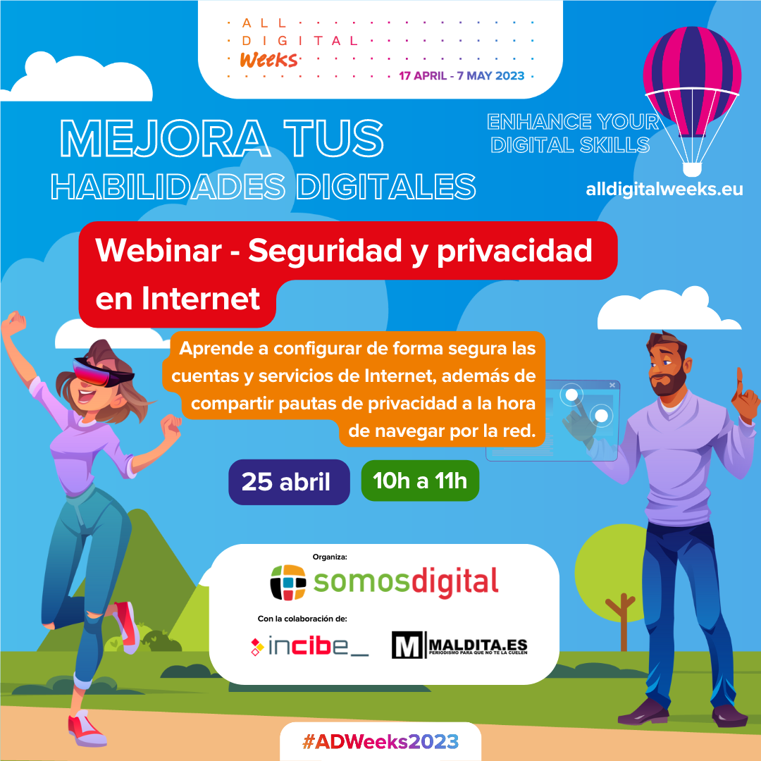 Somos Digital organiza, el 25 de abril a las 10h, con la colaboración del INCIBE y Fundación Maldita.es, en el marco de la Campaña ALL DIGITAL Weeks 2023, un webinar que lleva por título "Seguridad y privacidad en Internet".